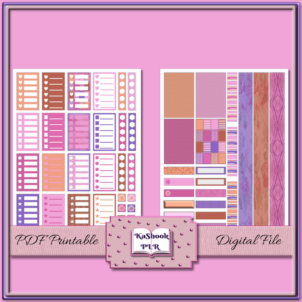 This is a PLR 8 1/2" x 11" PDF Printable Planner PLR Bundle containing an Editable 158-page PDF Printable planner file with undated, 12 Months, 6 Weekly 2 Page layout per Month with Sunday through Saturday week along with an 2 full 8 1/2" x 11" PDF sheets containing 50 coordinating printable stickers that can be printed onto label stock and cut out. It also comes with an Affinity file.